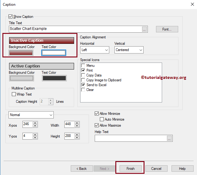 标题页面用于设置散点图标题的样式。在这里,您可以更改散点图的背景、颜色、位置等。目前,我们更改了非活动标题文本颜色和背景颜色。完成后,单击“完成”按钮。