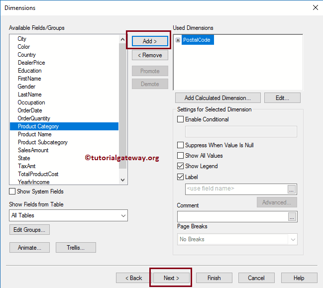 请选择您想在 QlikView 散点图中使用的维度列。在此示例中,我们将“邮政编码”维度添加到“已使用维度”部分。我建议您参考 QlikView 中的 从 Excel 导入数据到 QlikView 文章,以了解导入 Excel 表所涉及的步骤。