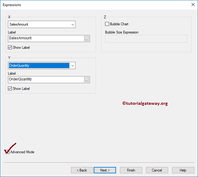 单击“下一步”按钮后,将打开“表达式”页面。从下面的屏幕截图可以看到,我们将“相同金额”选择为 X 轴字段,将“订单数量”选择为 Y 轴。这意味着我们将比较这两个度量值。通过选中“高级模式”选项,您可以执行更高级的操作。