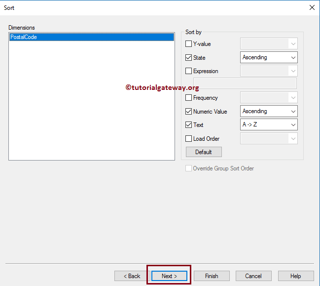排序页面用于指定邮政编码维度的排序顺序。在此 QlikView 散点图示例中,您可以按升序或降序对邮政编码进行排序。