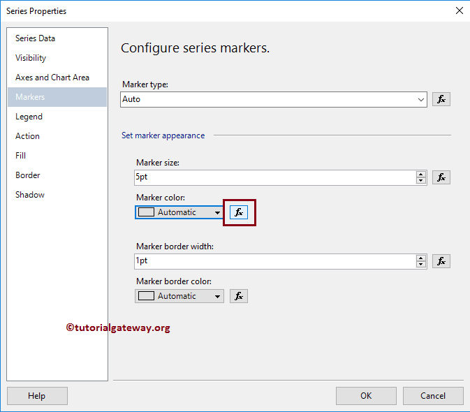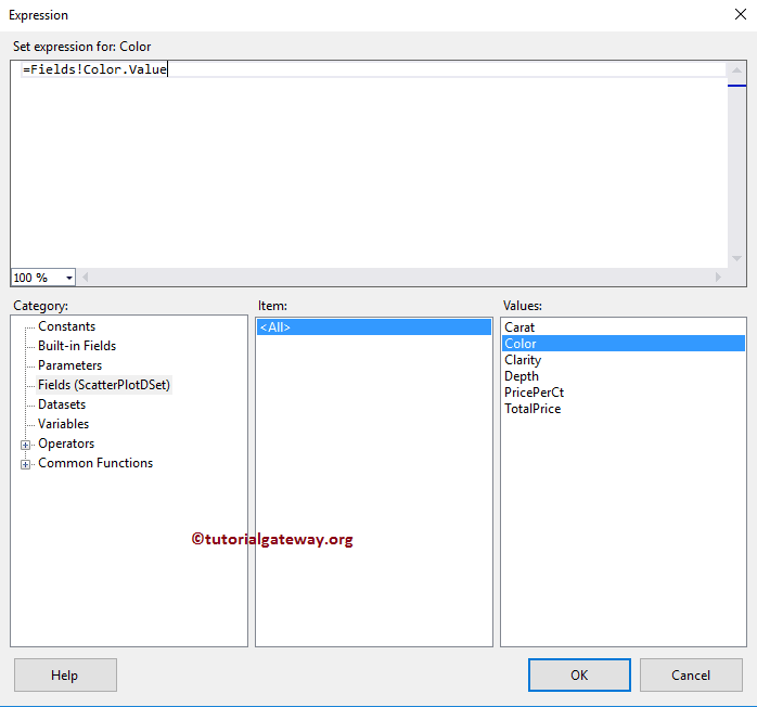 正如您所见,报告显示了完美的结果,也许如果我将默认的颜色组合更改为更有意义的输出会更好。为此,让我转到系列属性(如上所述),然后单击“使颜色”属性下的表达式按钮