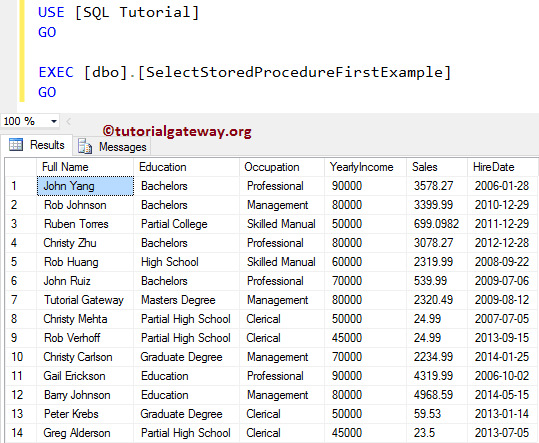 EXEC [dbo].[SelectStoredProcedureThirdExample] N'Professional'; GO --OR You Can Write EXEC [dbo].[SelectStoredProcedureThirdExample] @Occupation = N'Professional'; GO