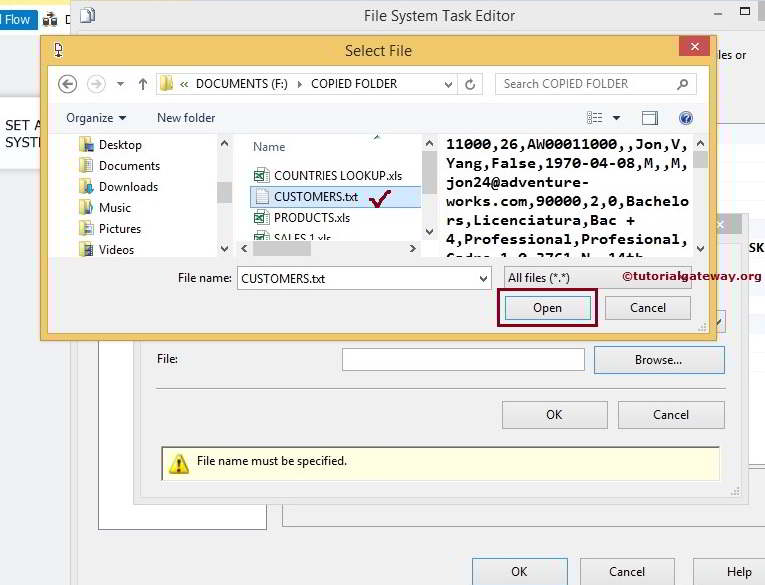 我们将文件夹复制到了 Documents Drive (F)。我们的任务是使用此 SSIS 文件系统任务更改 CUSTOMERS.txt 文件的默认属性。