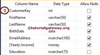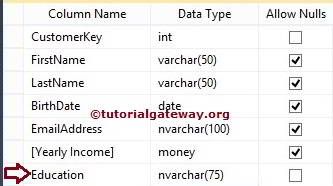 从上面的代码 Server 代码片段中,Education 列属于 varchar 数据类型,数据长度为 50,并且允许 NULL 值。