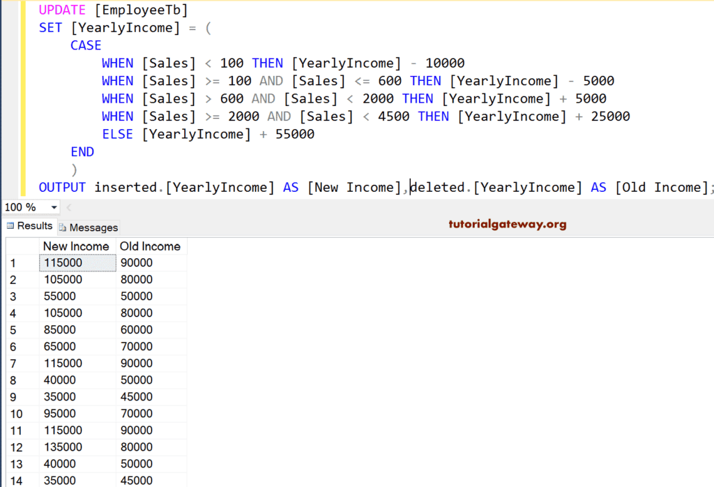 OUTPUT 子句返回我们在表中插入、删除和更新的数据的副本。这里,我们使用 OUTPUT 子句在一处显示旧的年收入值和更新的收入值。