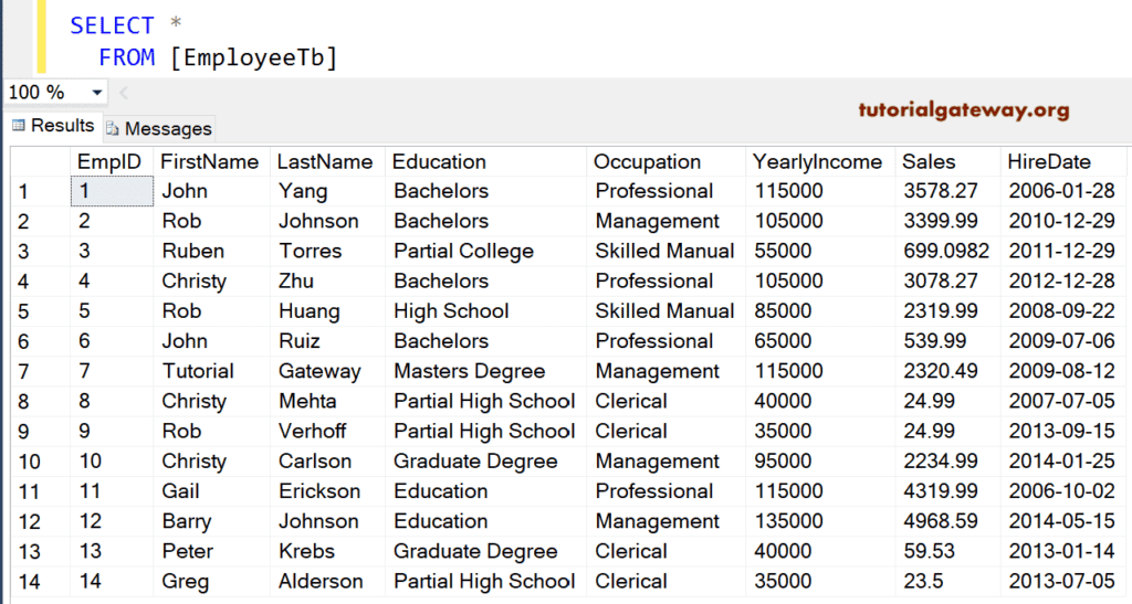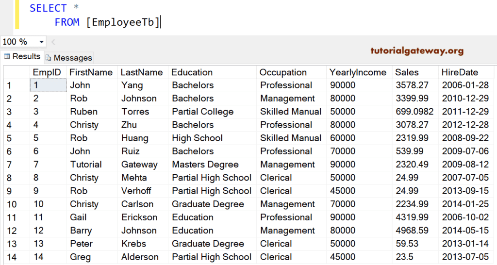 对于此 Case 语句演示,我们使用 EmployeeTb。