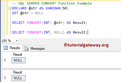 DECLARE @str AS VARCHAR(50) SET @str = NULL SELECT CONVERT(INT, @str) AS Result; SELECT CONVERT(INT, NULL) AS Result;