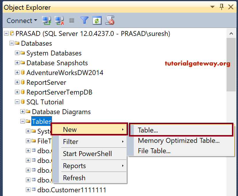 在 Management Studio 对象资源管理器中,展开您要创建表的数据库文件夹。请选择该文件夹,右键单击它将打开上下文菜单。选择“新建”选项,然后选择如下所示的选项。