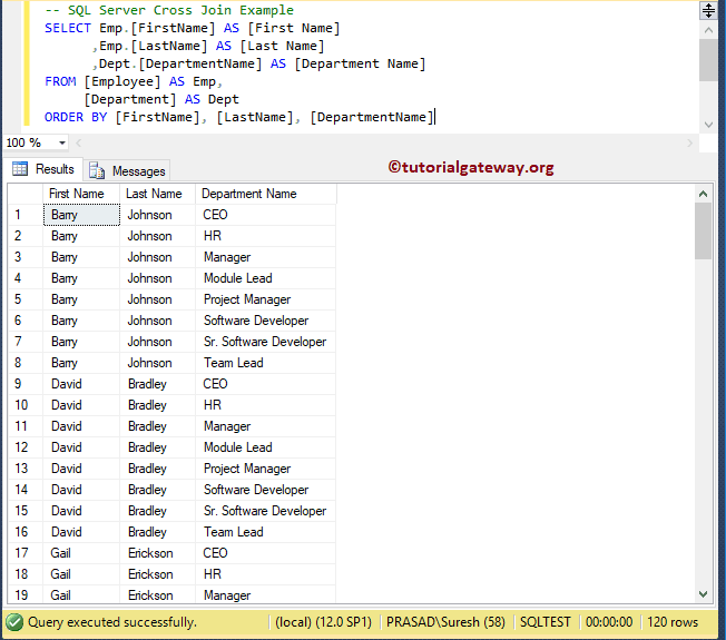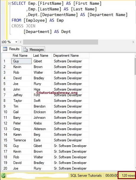 如果您观察下面的连接截图,它显示了 120 条记录。这意味着 Employee 表中的 15 行乘以 Department 表中的 8 行。