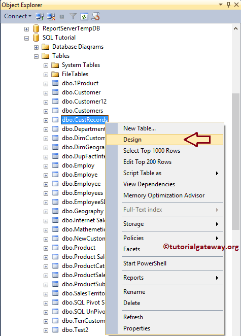 我们可以使用 Transact 查询和 Management Studio 创建默认约束。要使用 Management Studio 创建默认约束,请转到对象资源管理器。展开包含该表的数据库文件夹。请选择要创建的表(此处为 Custrecords),然后右键单击它将打开上下文菜单。请选择“设计”选项。