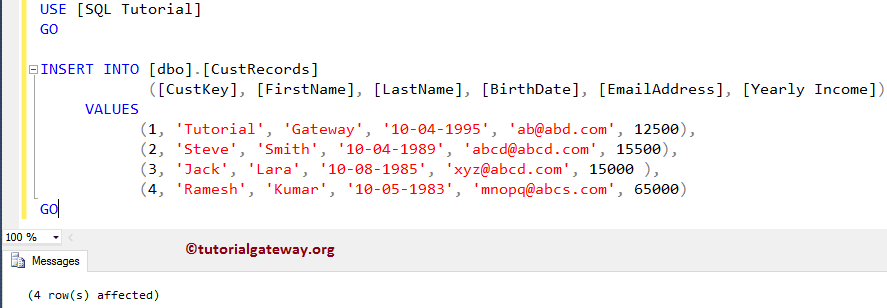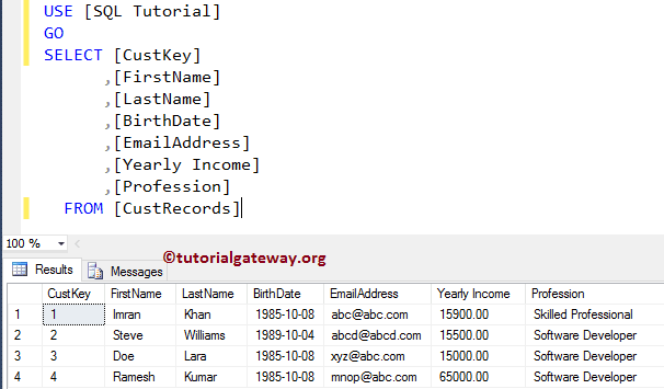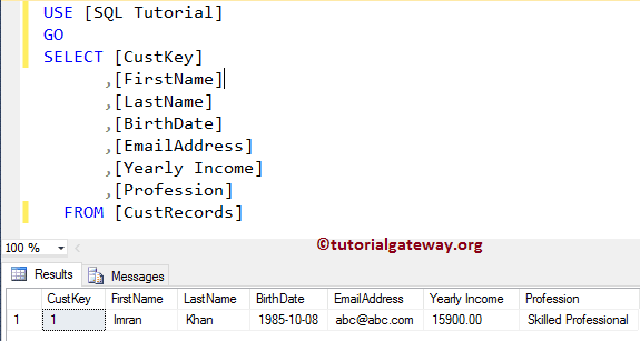 CREATE TABLE [dbo].[CustRecords]( [CustKey] [int] NOT NULL PRIMARY KEY, [FirstName] [varchar](50) NOT NULL, [LastName] [varchar](50) NULL, [BirthDate] [date] NULL, [EmailAddress] [nvarchar](50) NULL, [Yearly Income] [money] NULL, [Profession] [nvarchar](100) NOT NULL ) GO