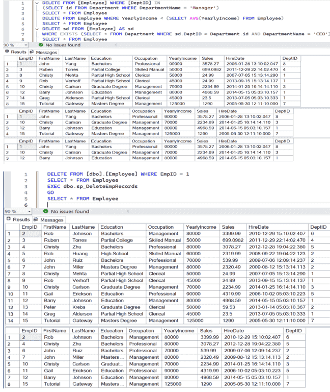 与上述 SQL DELETE 语句或命令示例类似,我们可以使用多个条件创建更复杂的查询以获得精确的结果集。在此示例中,我们使用 WHERE 子句中的 AND 运算符在开始删除记录之前检查多个条件。第一个条件测试职业是否为“专业人士”,AND 运算符是连接词。下一个条件检查年收入是否小于 90000。如果两个条件都为 TRUE,则该员工记录将从表中删除。