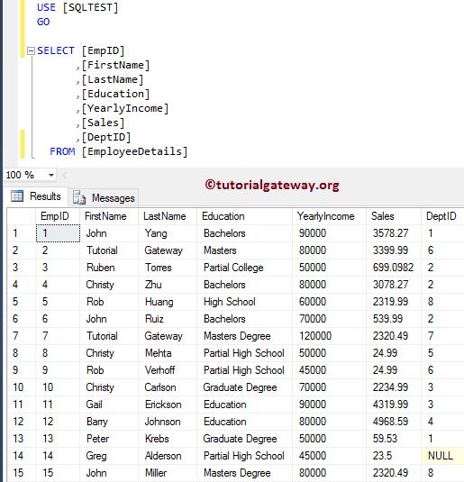 SELECT * FROM ( SELECT [EmpID] ,[FirstName] ,[LastName] ,[Education] ,[YearlyIncome] ,[Sales] ,[DeptID] FROM [EmployeeDetails] ) AS [Derived Employee Details] WHERE [Sales] > 500