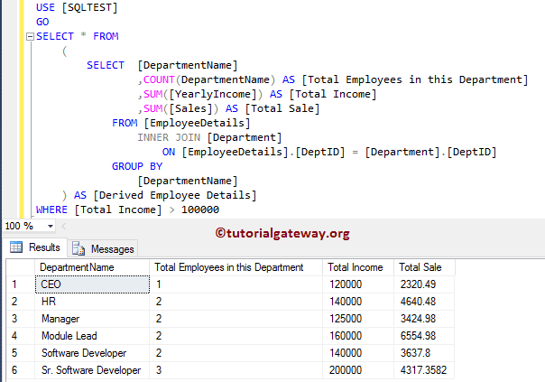 SELECT * FROM ( SELECT [DepartmentName] ,COUNT(DepartmentName) AS [Total Employees in this Department] ,SUM([YearlyIncome]) AS [Total Income] ,SUM([Sales]) AS [Total Sale] FROM [EmployeeDetails] INNER JOIN [Department] ON [EmployeeDetails].[DeptID] = [Department].[DeptID] GROUP BY [DepartmentName] ) AS [Derived Employee Details] WHERE [Total Income] > 100000