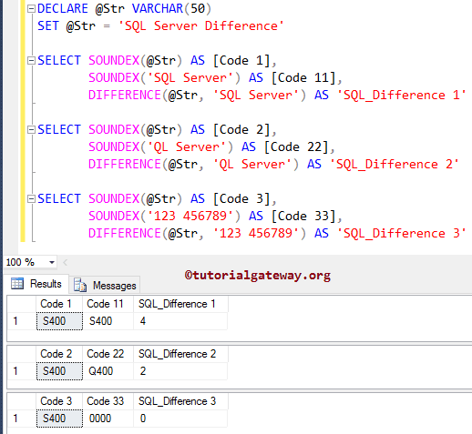 DECLARE @Str VARCHAR(50) SET @Str = 'SQL Server' SELECT DIFFERENCE(@Str, 'SQL Server') AS 'SQL_Difference 1' SELECT DIFFERENCE(@Str, 'Server') AS 'SQL_Difference 2' SELECT DIFFERENCE(@Str, 'QL Server') AS 'SQL_Difference 3' SELECT DIFFERENCE(@Str, 'SQL Server tutorial') AS 'SQL_Difference 4' SELECT DIFFERENCE(@Str, 'SQ erv') AS 'SQL_Difference 5' SELECT DIFFERENCE(@Str, '123 456789') AS 'SQL_Difference 6'