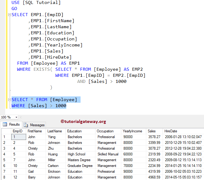 以下查询将查找表中所有 [Sales] 大于 1000 的员工。