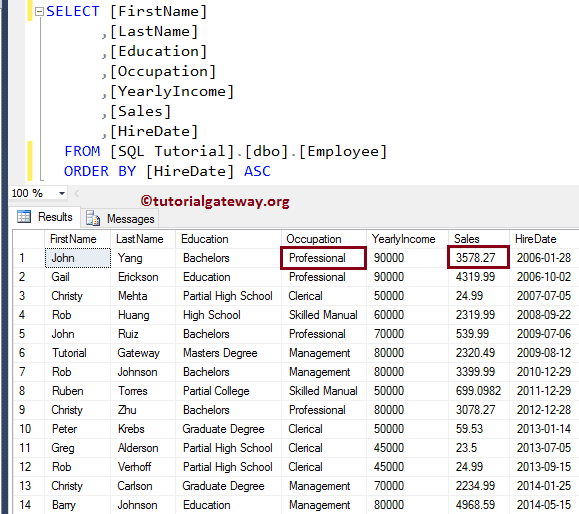 下面的SQL Server语句按升序对Employee表按HireDate排序。让我向您展示。