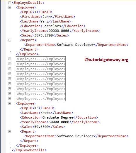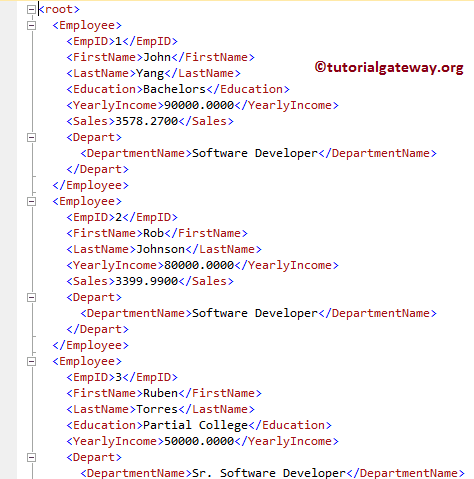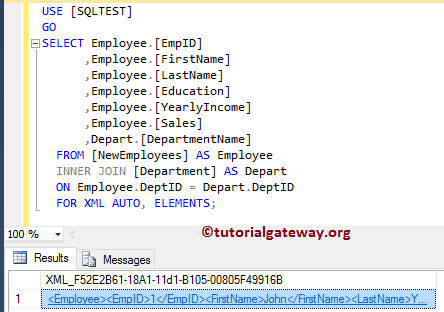 如您所见,所有列都作为 <Employee> 和 <Depart> 元素的属性添加。在此示例中,我们将展示如何将列值添加为子元素(而不是属性)。要实现这一点,我们在 SQL Server 中将 ELEMENTS 关键字与 FOR XML AUTO 一起使用。