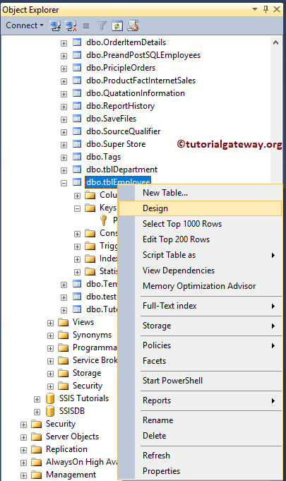 在此示例中,我们将向您展示如何使用 Management Studio 创建。为此,请转到对象资源管理器。接下来,请展开 Database 文件夹,然后选择您要创建的表。接下来,右键单击它将打开上下文菜单。请选择 Design 选项。