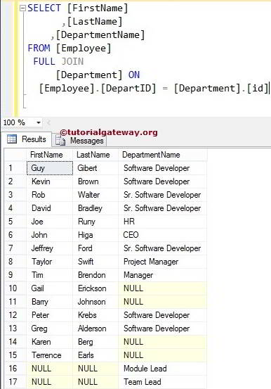 - 如果您观察上面的截图,尽管 Employee 表中有 15 条记录,但全外连接合并并显示了 17 条记录,因为 Department 表中有两条记录,即部门 ID 3, 4(Module Lead 和 Team Lead),15 + 2 = 17 条总记录。