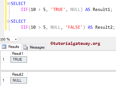 SELECT IIF(10 > 5, 'TRUE', NULL) AS Result1; SELECT IIF(10 > 5, NULL, 'FALSE') AS Result2;