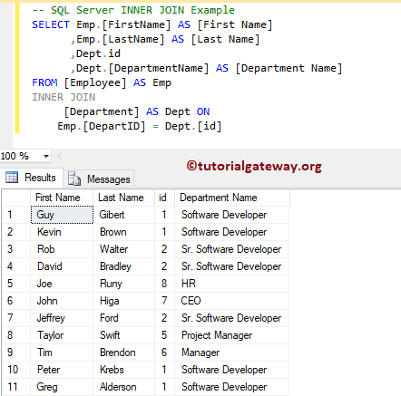 如果您观察上面的屏幕截图,尽管 Employee 表中有 15 条记录,但 Inner join 显示了 11 条记录。这是因为 Employee 表中其余四条记录(即 ID 号为 10、11、14 和 15)的 Department Id 为 NULL。