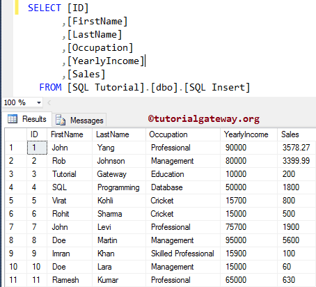 在此 SQL Server INSERT 语句示例中,我们将少量记录放入表中。请记住,当您将少量记录加载到目标时,必须指定列名。