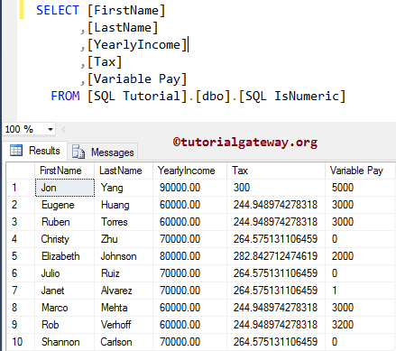 在此示例中,我们将使用 IsNumeric 函数检查 Lastname、[YearlyIncome]、[Tax] 和 [Variable pay] 列是否包含数字数据。