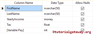 如果观察上面的截图,有五列,其中 2 列是 NVarchar 类型,1 列是 Money 类型,另一列是 Float 类型,最后一列是 Integer 类型。