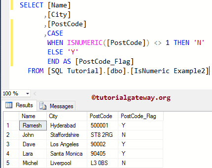 在下面的语句中,我们使用 IsNumeric 函数检查 LastName 列是否为数字。我们还使用 SQL Server 中的 别名 列重新指定了一个名为 Name_Flag 的新列。