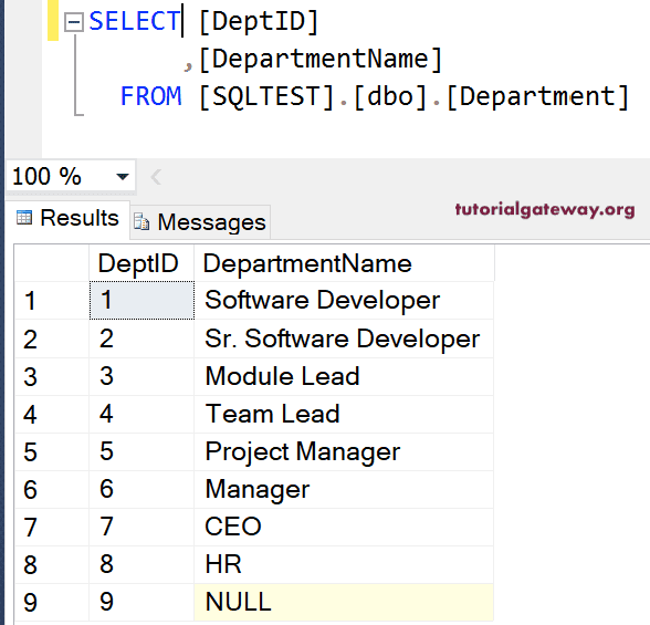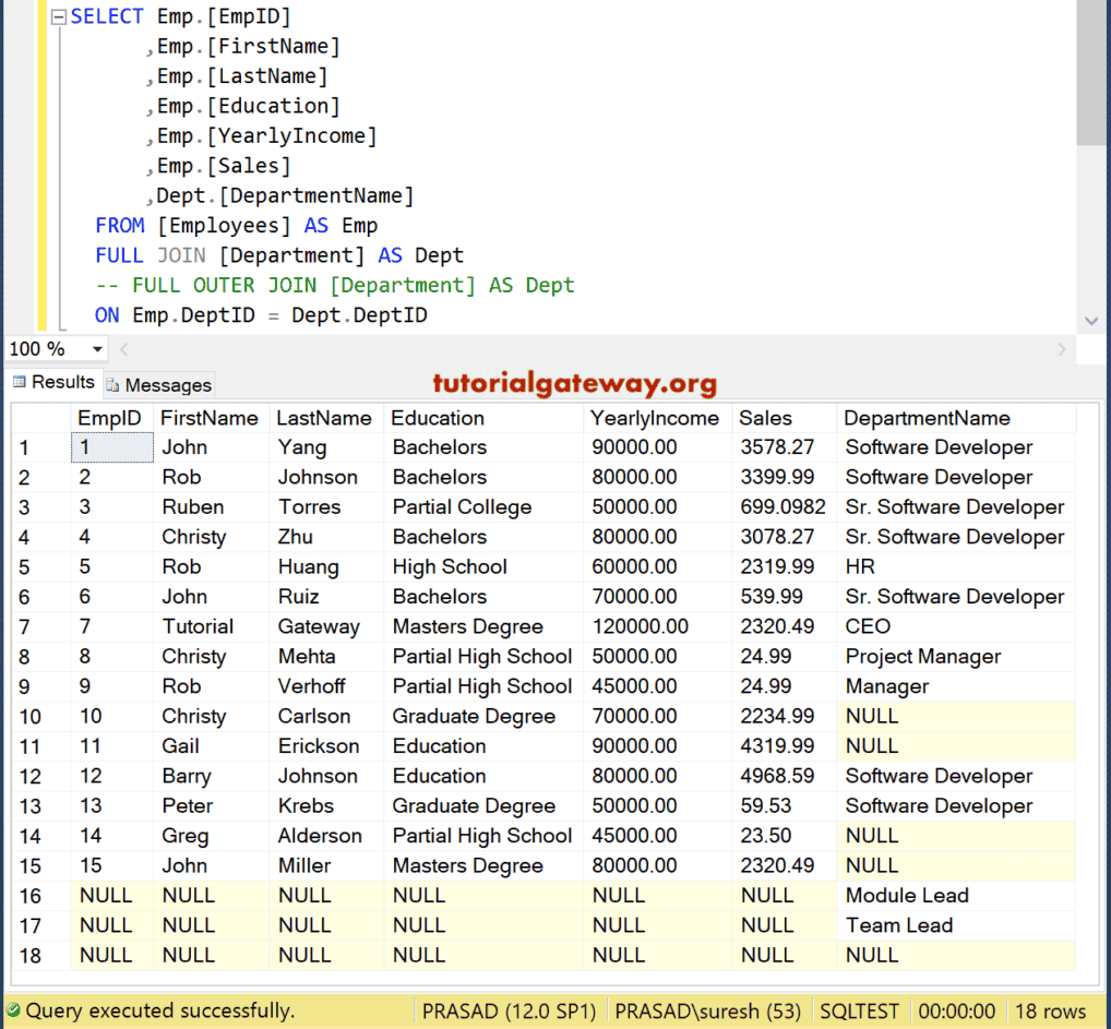 此查询返回“Employees”和“Department”表中的所有记录。这意味着没有部门名称的员工和没有员工的部门 ID。如您在结果集中所见,它生成了 18 行。员工表中有 15 行,部门表中有三行额外行。它们是 Module Lead、Team Lead 和 NULL。