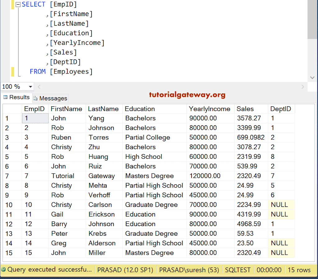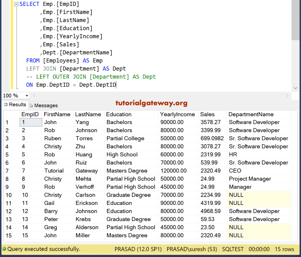 此示例展示了如何在 SQL Server 中编写左外连接以获取员工表中的所有员工及其对应的(匹配的)部门名称。EmpID 为 10、11、14 和 15 的员工没有相关的部门名称,因此这些行填充了 NULL 值。