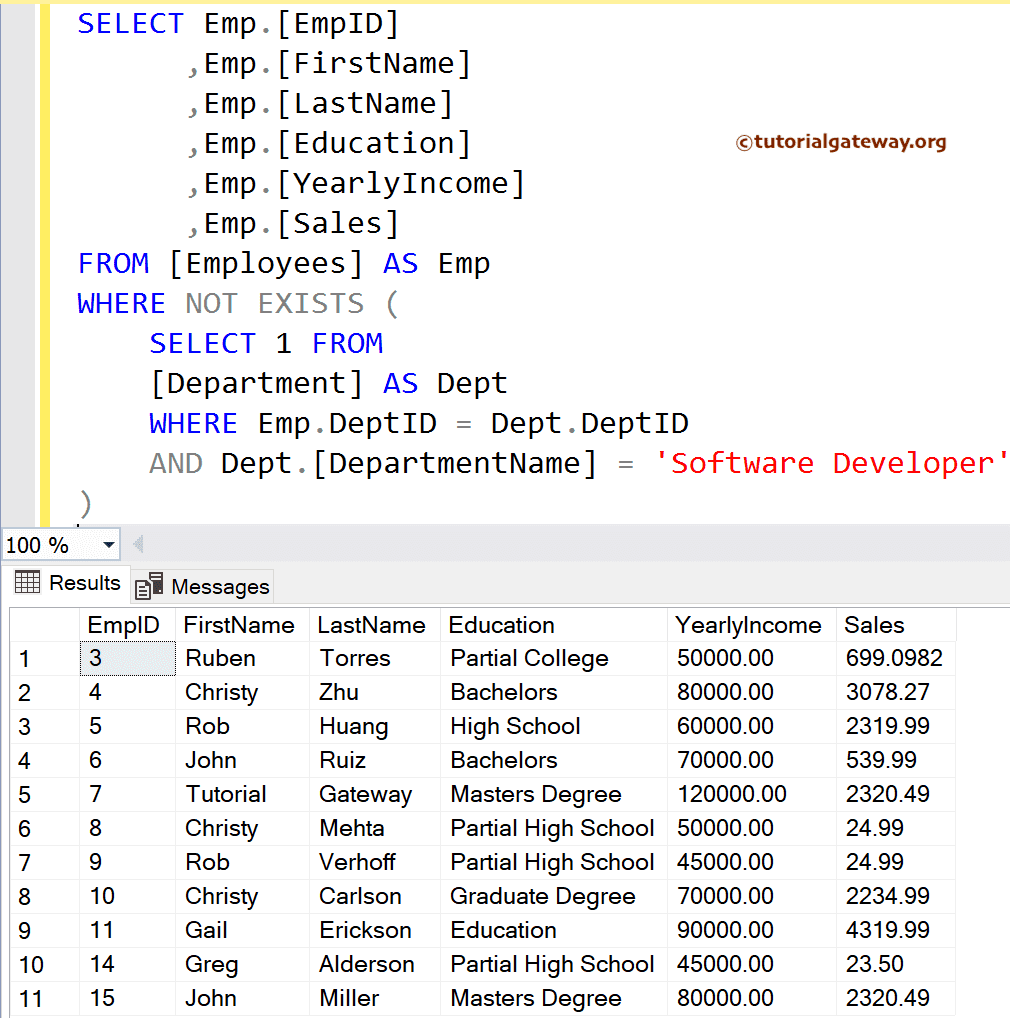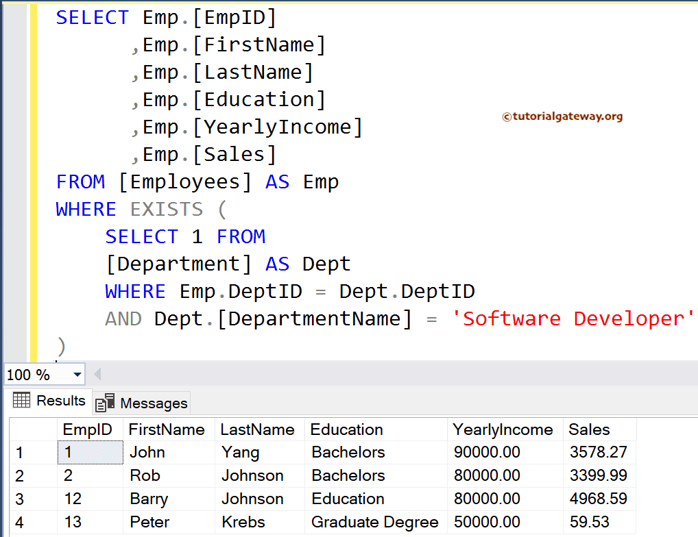 下面的半连接查询显示所有具有匹配部门名称的员工,该部门名称必须是 Software Engineer。为了实现此示例,我们使用了 EXISTS 运算符。