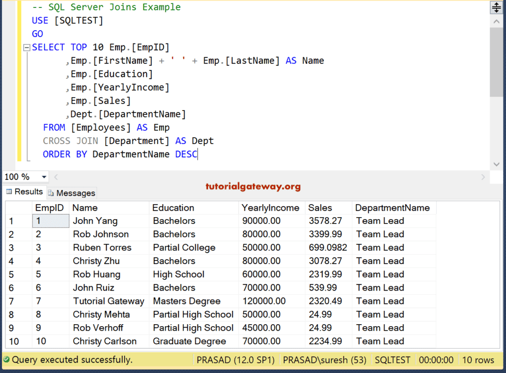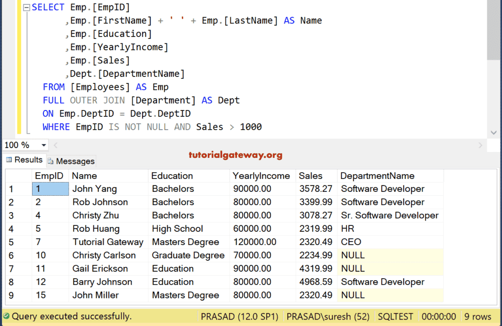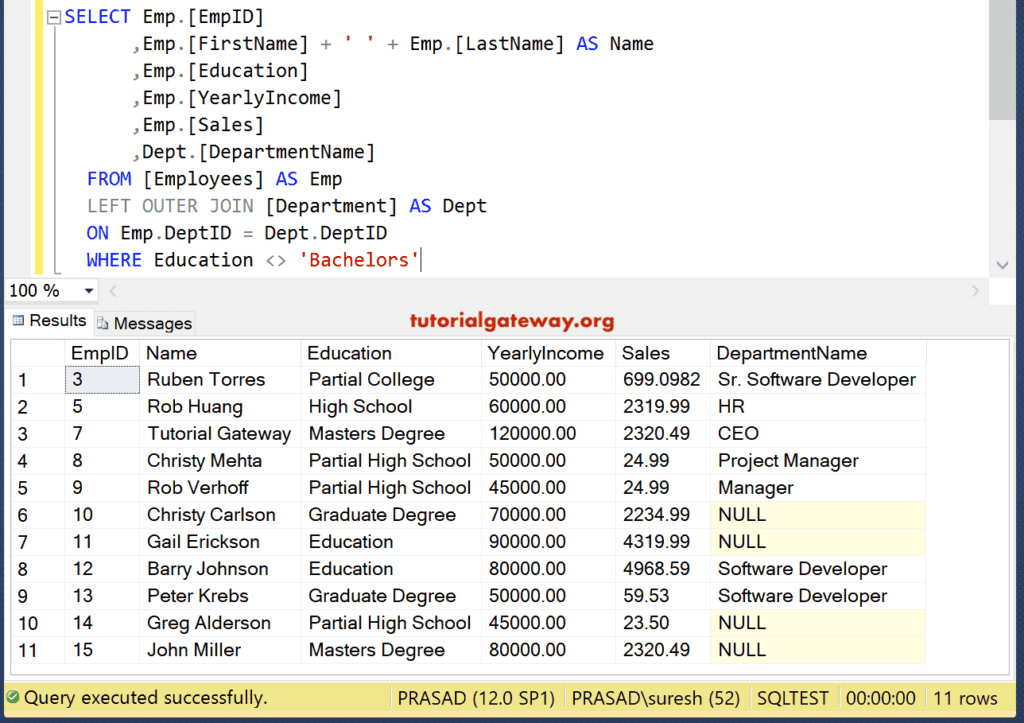 此查询将根据“DeptID”列连接“Employees”和“Department”表,并返回名字、姓氏、教育程度、部门名称、年收入和销售额。尽管员工表中有 15 行,但 SQL 内连接只写入了 11 条记录,因为 EmpID 为 10、11、14 和 15 的 DeptID 为 NULL。