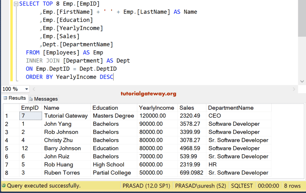 在此示例中,我们使用 Inner 连接 Employees 和 Departments。接下来,我们使用 Order By 子句按年收入降序排序记录。最后,Top 子句将从查询结果中选择前 8 条记录。