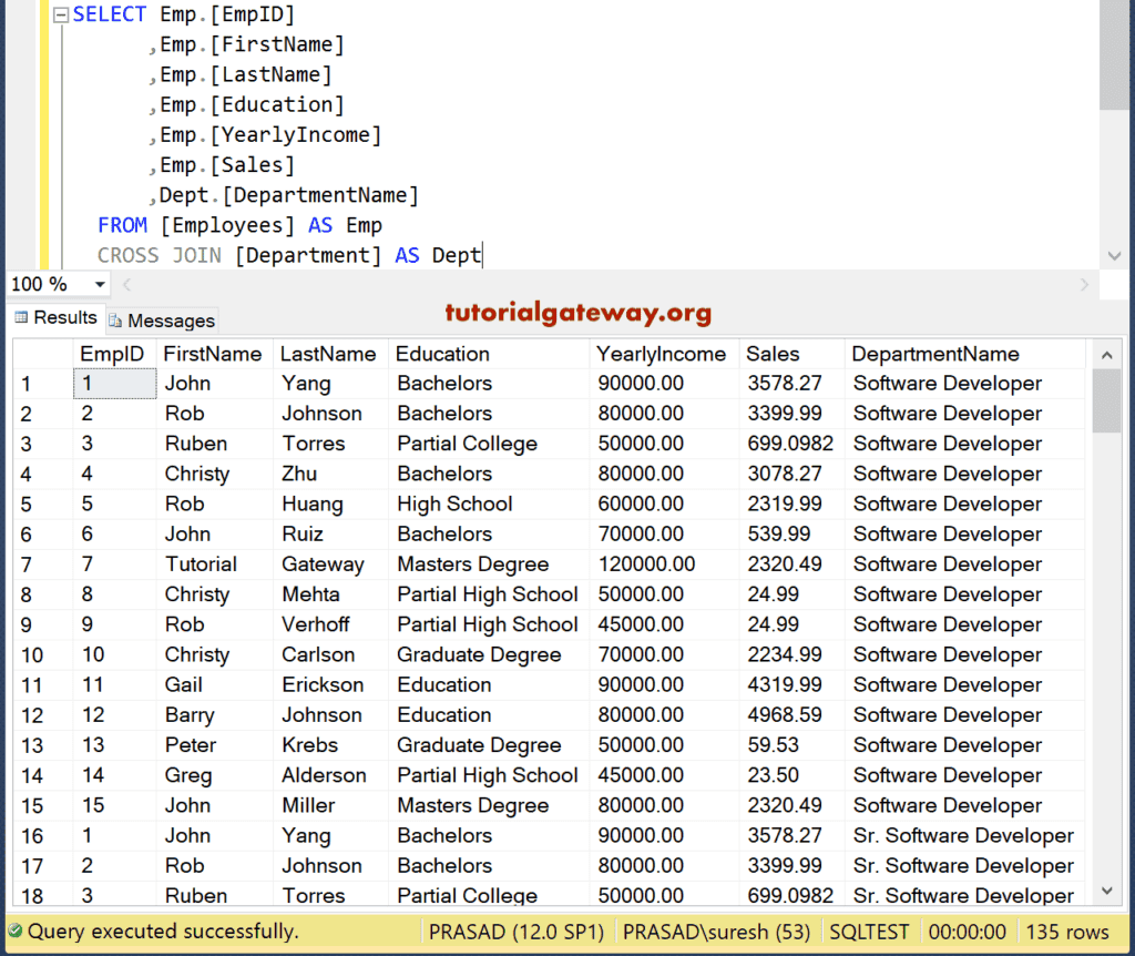 此交叉连接示例展示了如何查找笛卡尔积。它组合了 Employees 和 Department 表,并返回每个员工与每个部门名称的配对。结果集将是 Employees 中的行数乘以 Department 中的行数。
