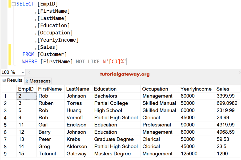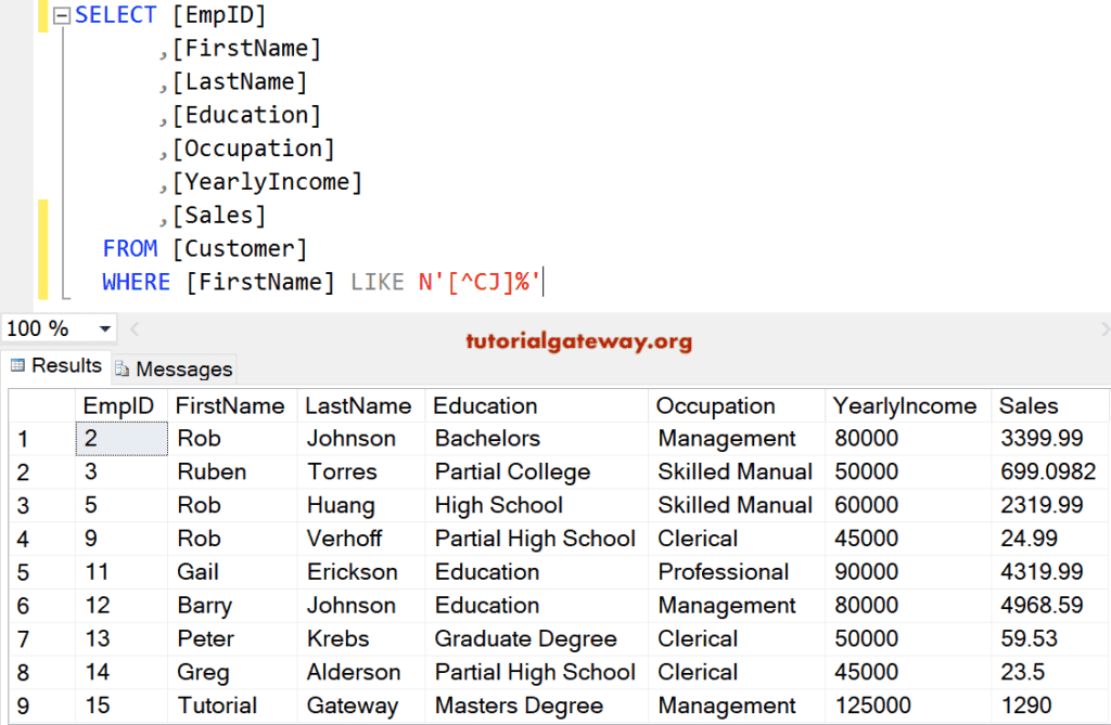 ![Using Like [] Character List](https://tutorialgateway.cn/wp-content/uploads/SQL-LIKE-Wildcard-10.png)