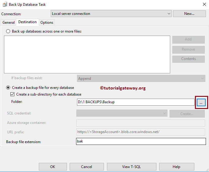 以下是 SQL 维护计划目标选项卡中可用的属性列表。正如您所看到的,我们选择 D 文件夹来保存备份文件,其扩展名为 bak。您可以使用...(浏览)按钮来选择路径。