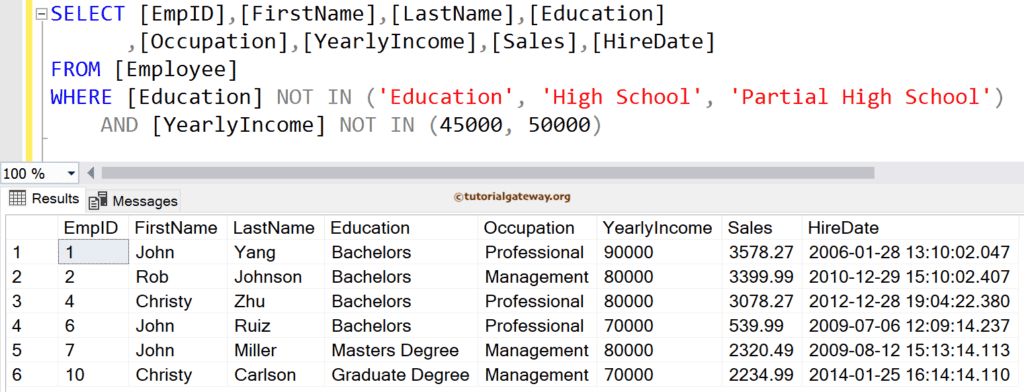 下面的查询查找教育程度不等于“Education”、“High School”或“Partial High School”,并且年收入不等于 45000 或 50000 的员工。