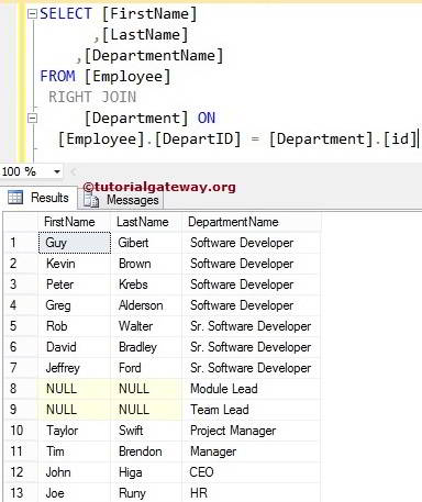 正如我们之前所说,使用 Outer 关键字是可选的。所以,我将删除 Outer 关键字,并使用 SQL Server RIGHT JOIN 进行工作。