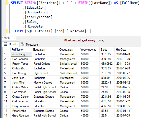 SELECT RTRIM(' SQL Server Tutorials at Tutorial Gateway ') AS Result;