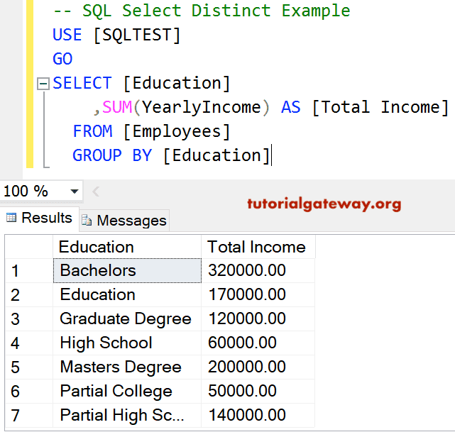 SELECT [Education] ,SUM(YearlyIncome) AS [Total Income] FROM [Employees] GROUP BY [Education]
