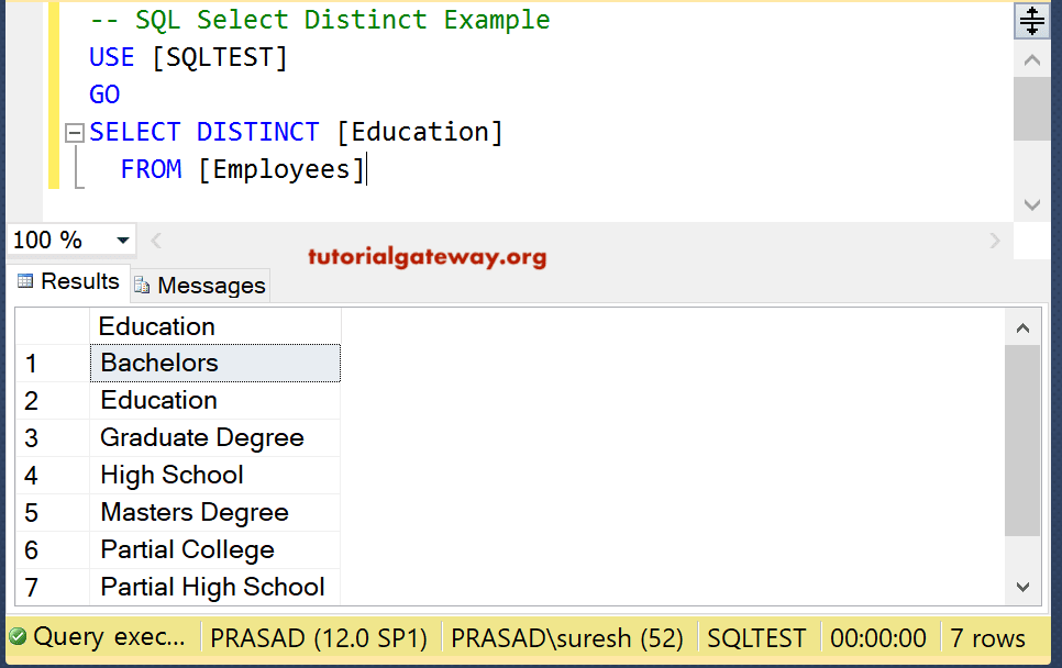 当我们在多列上使用它时,以下查询返回多列的唯一组合,而不是唯一的单个记录。在此示例中,我们选择 Education 列和 Yearly Income 列中记录的唯一组合。