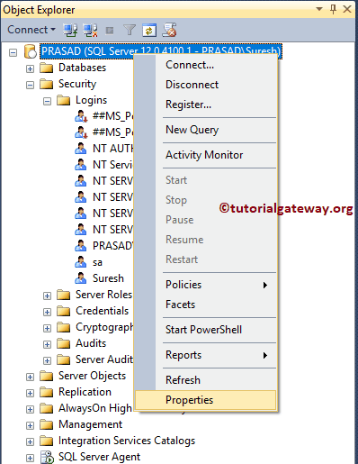 在某些情况下,您的数据库将只接受 Windows 身份验证。在这些情况下,您必须将身份验证模式更改为混合模式。右键单击实例名称,然后从上下文菜单中选择“属性”选项。