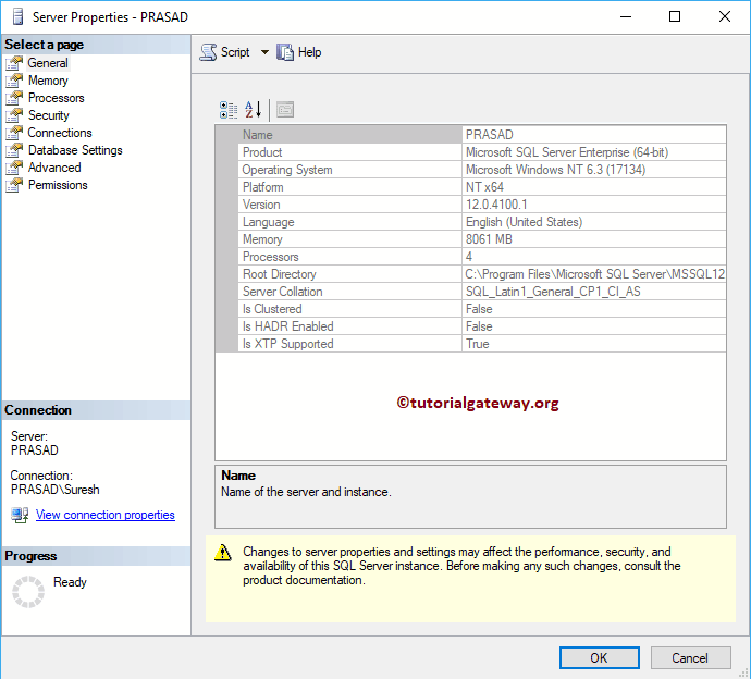 请导航到“安全性”选项卡。从下面的屏幕截图中,您可以看到“服务器身份验证”已选择为“Windows 身份验证模式”。这意味着它只接受本地 Windows 用户。
