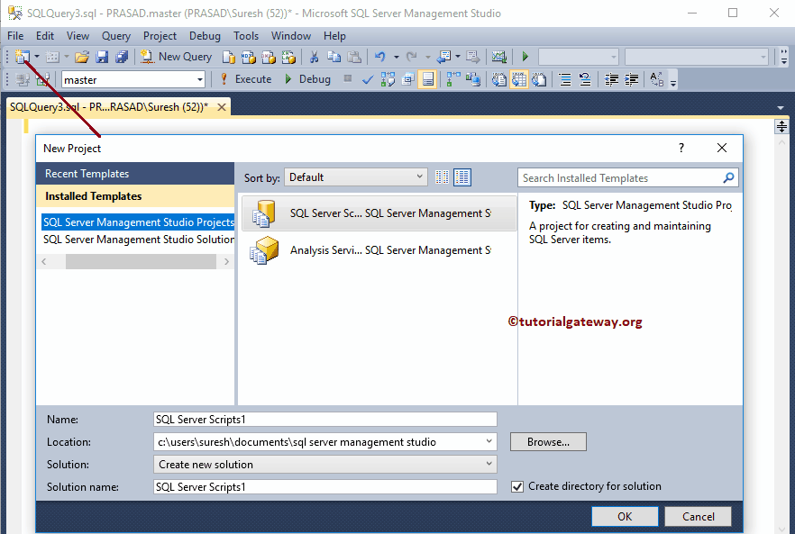 正如我们所说,如果您在 SQL Server Management Studio 中单击“新建项目”按钮,将打开下图所示的窗口。在这里您可以选择 Scripts、Analysis Services Scripts 或 Black Solutions。