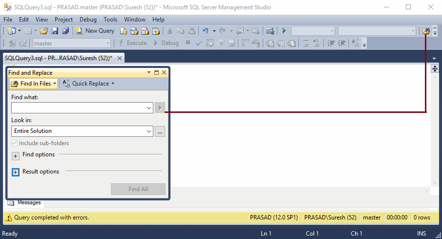 - Intellisense 已启用:单击此项,您可以为此查询窗口启用 SQL Server Management Studio Intellisense。它将帮助您查找语法错误,并自动建议函数名称。