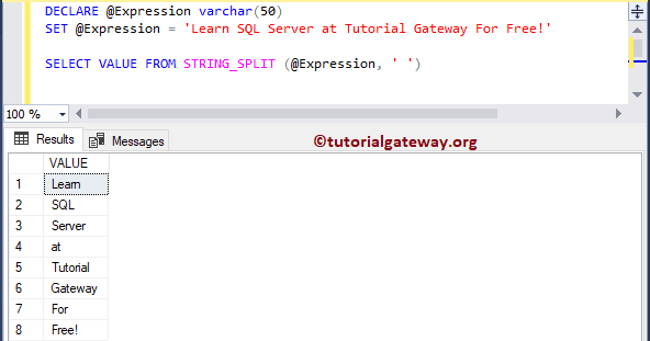 DECLARE @Expression varchar(50) SET @Expression = 'Learn SQL Server at Tutorial Gateway For Free!' SELECT VALUE FROM STRING_SPLIT (@Expression, ' ')