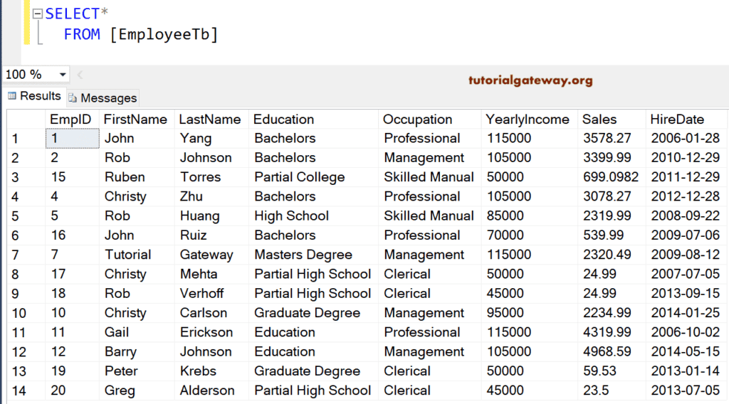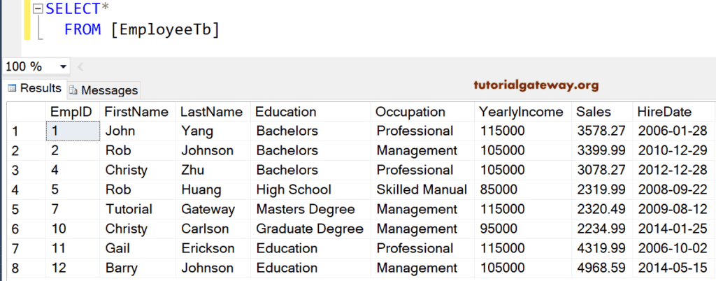我们主要在WHERE子句中使用子查询。这类似于WHERE expression NOT IN,或IN子query等。对于此SQL Server子查询或嵌套查询演示,我们使用Employee表。