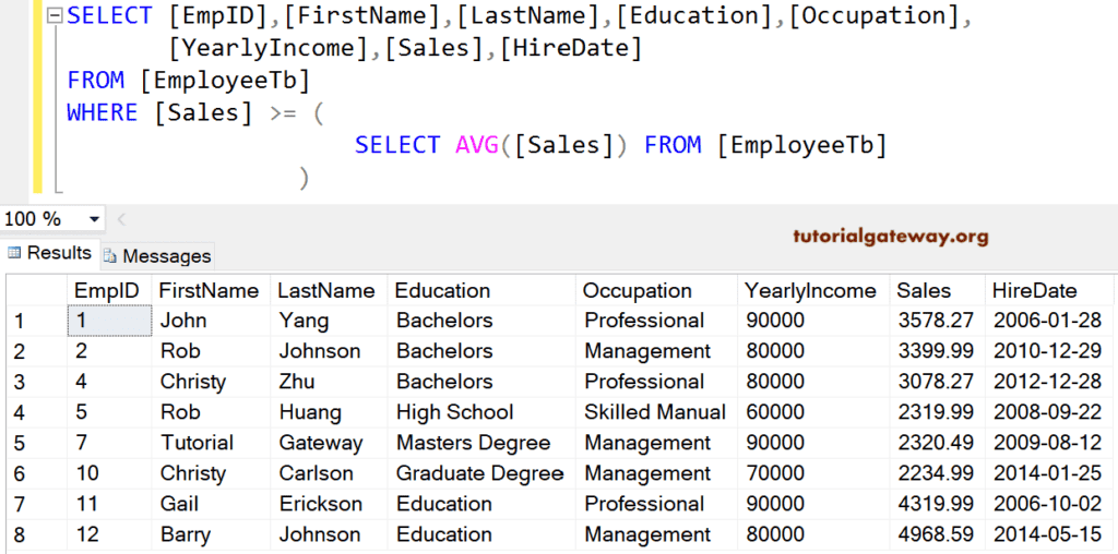 首先,它将在WHERE子句中执行内部查询。然后,在内部查询中,我们计算销售额的平均值。